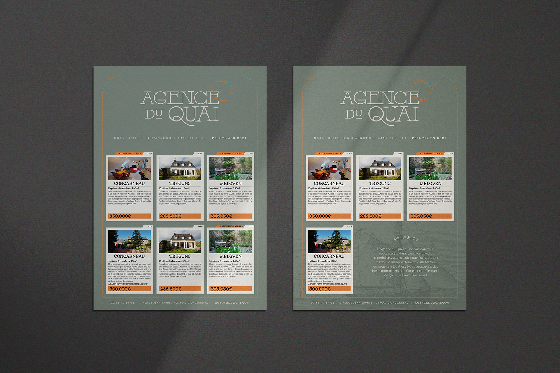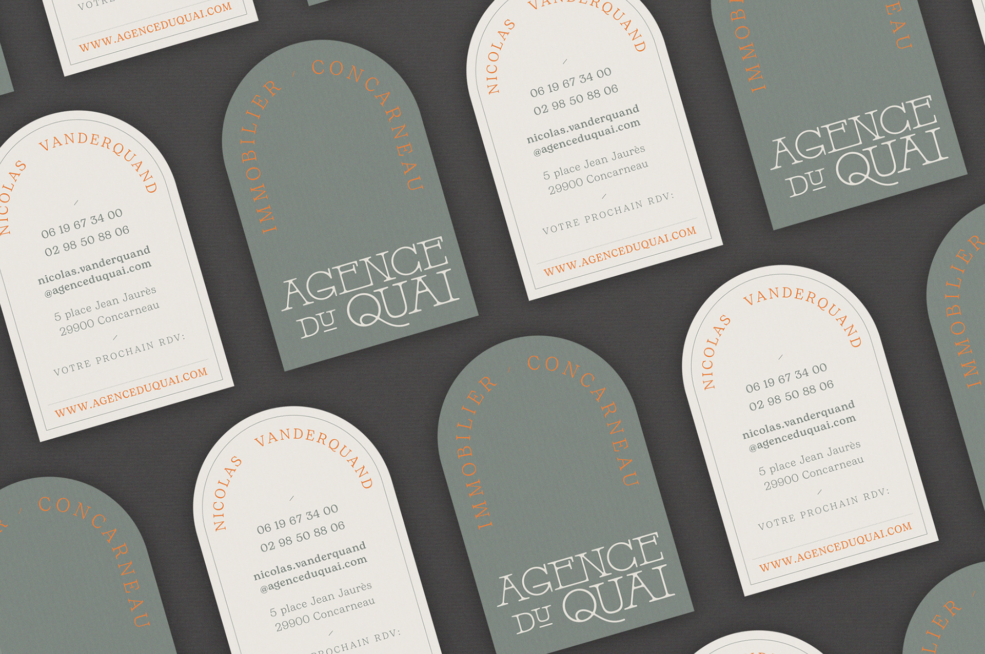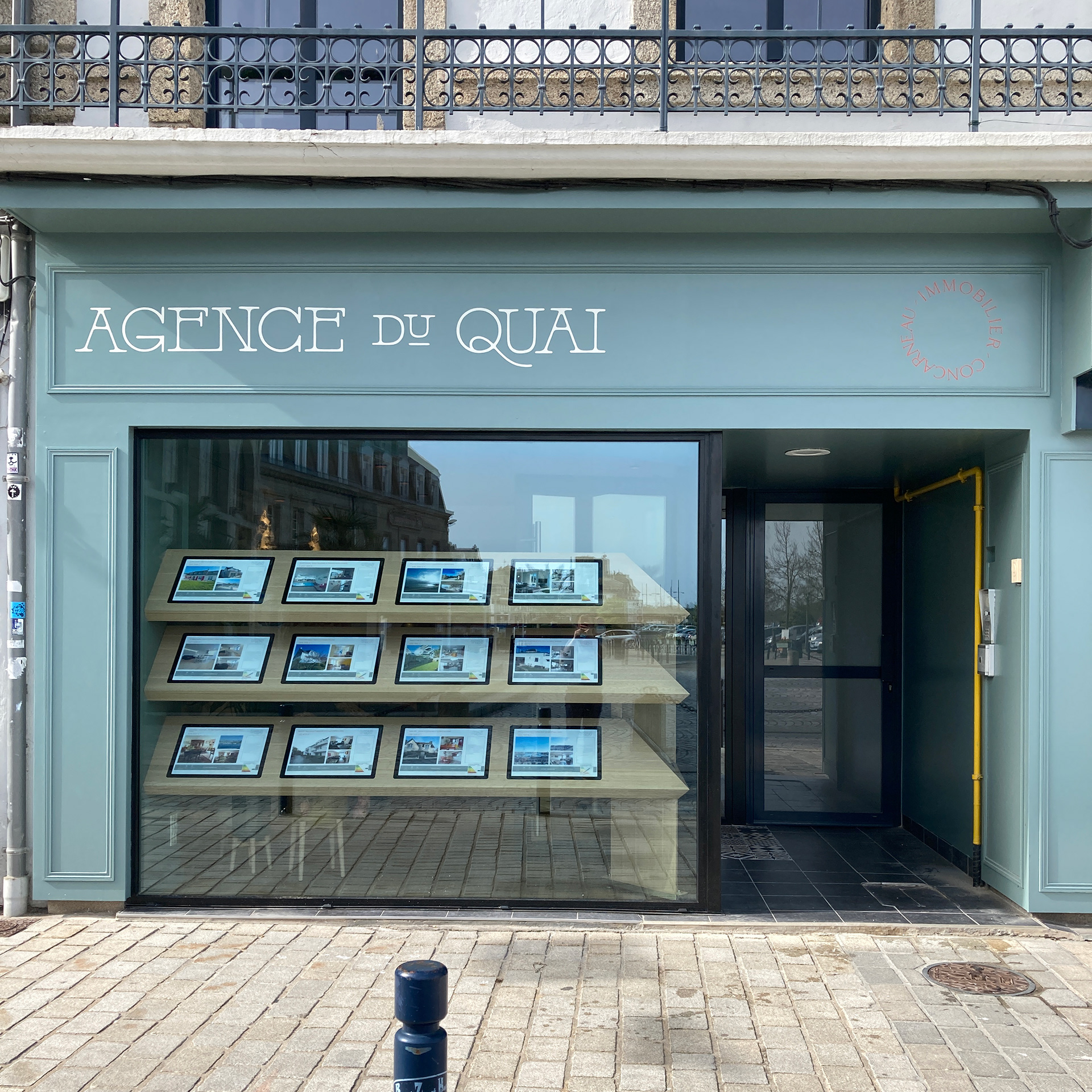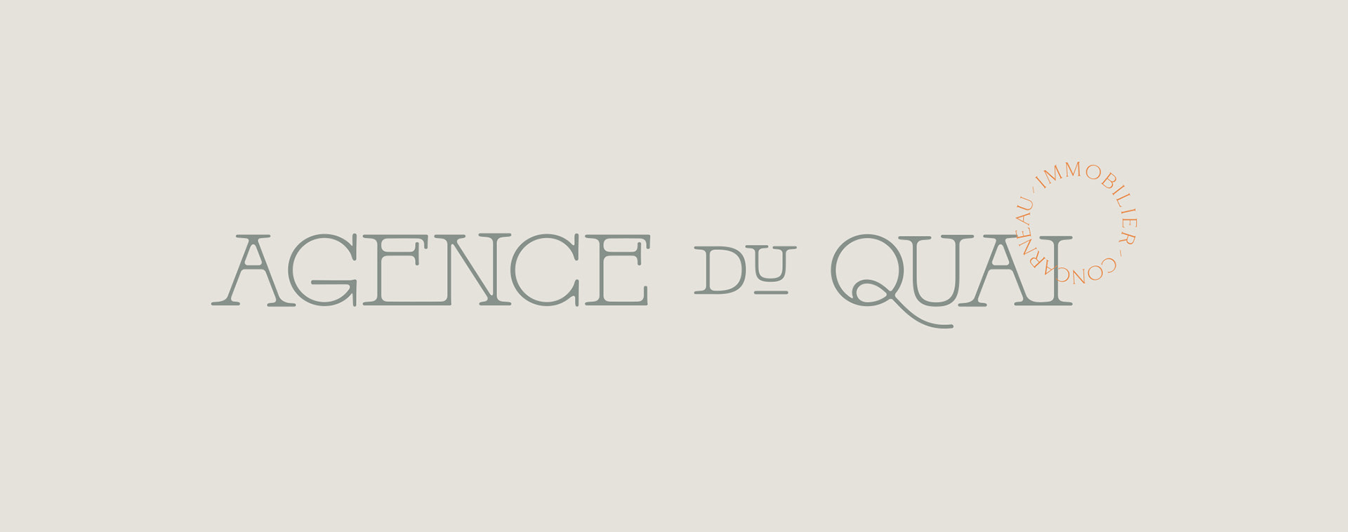 L'Agence du Quai est une agence immobilière située à Concarneau (29). Marianne et Nicolas voulaient une identité rétro et élégante avec un positionnement premium. Un design au petit goût de mais contemporain et qui raconte une histoire, la leur, celles des maisons... Pour le logo, j'ai choisi une typographie qui me rappelait les machines à écrire d'autrefois, que j'ai retravaillée et redesignée. Ensemble, nous avons choisie les couleurs, douces et piquantes. L'identité graphique de leur supports de communication ainsi que le design extérieur de l'agence ont été créés dans cette même veine. C'est pourquoi, je leur ai recommandé d'aller jusqu'au bout et de s'offrir une façade peinte à l'ancienne avec l'aide de Morgane Côme, peintre en lettre basée à Quimperlé. Le résultat est vraiment magnifique ;)