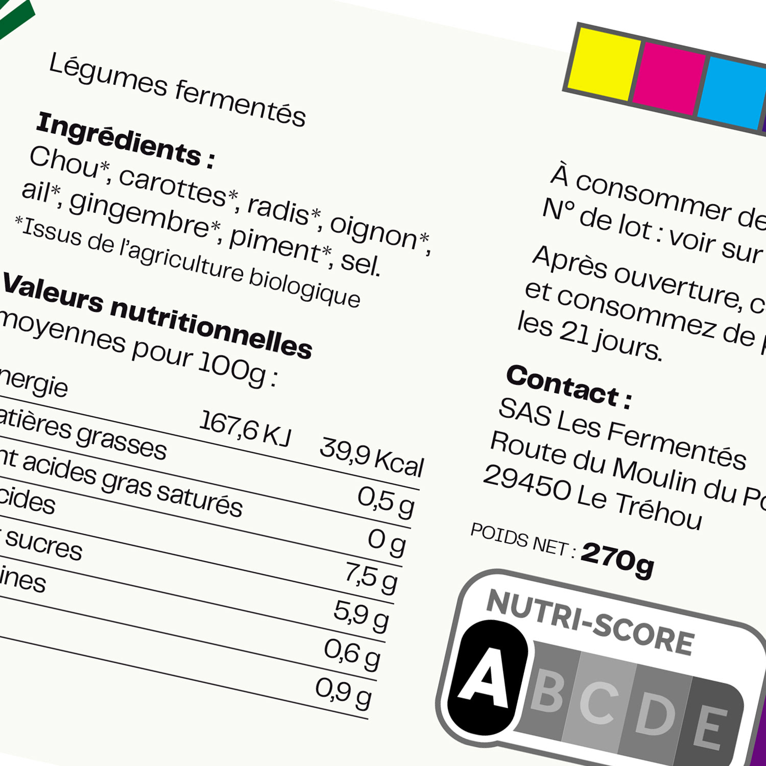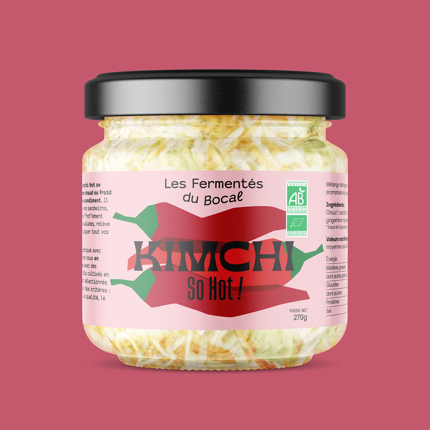 Gaëlle Lamarque, fondatrice des Fermentés du Bocal, propose des légumes lacto fermentés pour la Restauration hors domicile, les cantines... En 2023, Gaëlle a souhaité lancer une gamme de Kimchi destiné au circuit GMS Bio. C'est dans ce cadre qu'elle m'a contactée afin de créer l'identité graphique, le logotype, les packagings et les outils d'aide à la vente. Elle souhaitait une identité colorée, impactante, un design avec une forte personnalité. D'un point de vue graphique, je voulais quelque chose de frais et de dynamique. Je souhaitais également y rajouter des influences du pays d'origine du Kimchi, la Corée, que l'on retrouve dans le choix de la typo de la dénomination. Le tout accompagné d'illustrations inspirées de l'art des papiers découpés japonais. J'ai également accompagné Gaëlle sur la rédaction des textes, des dénominations et sur la mise en page de ses argumentaires de vente.