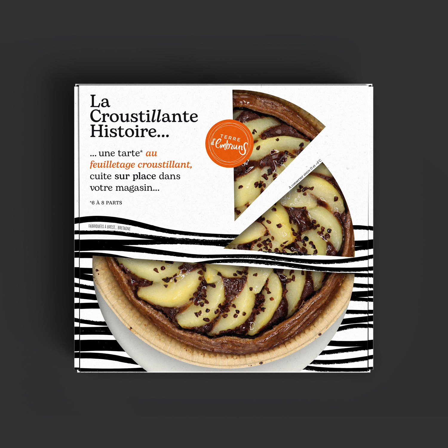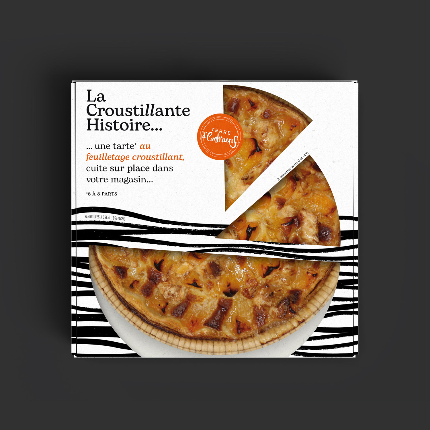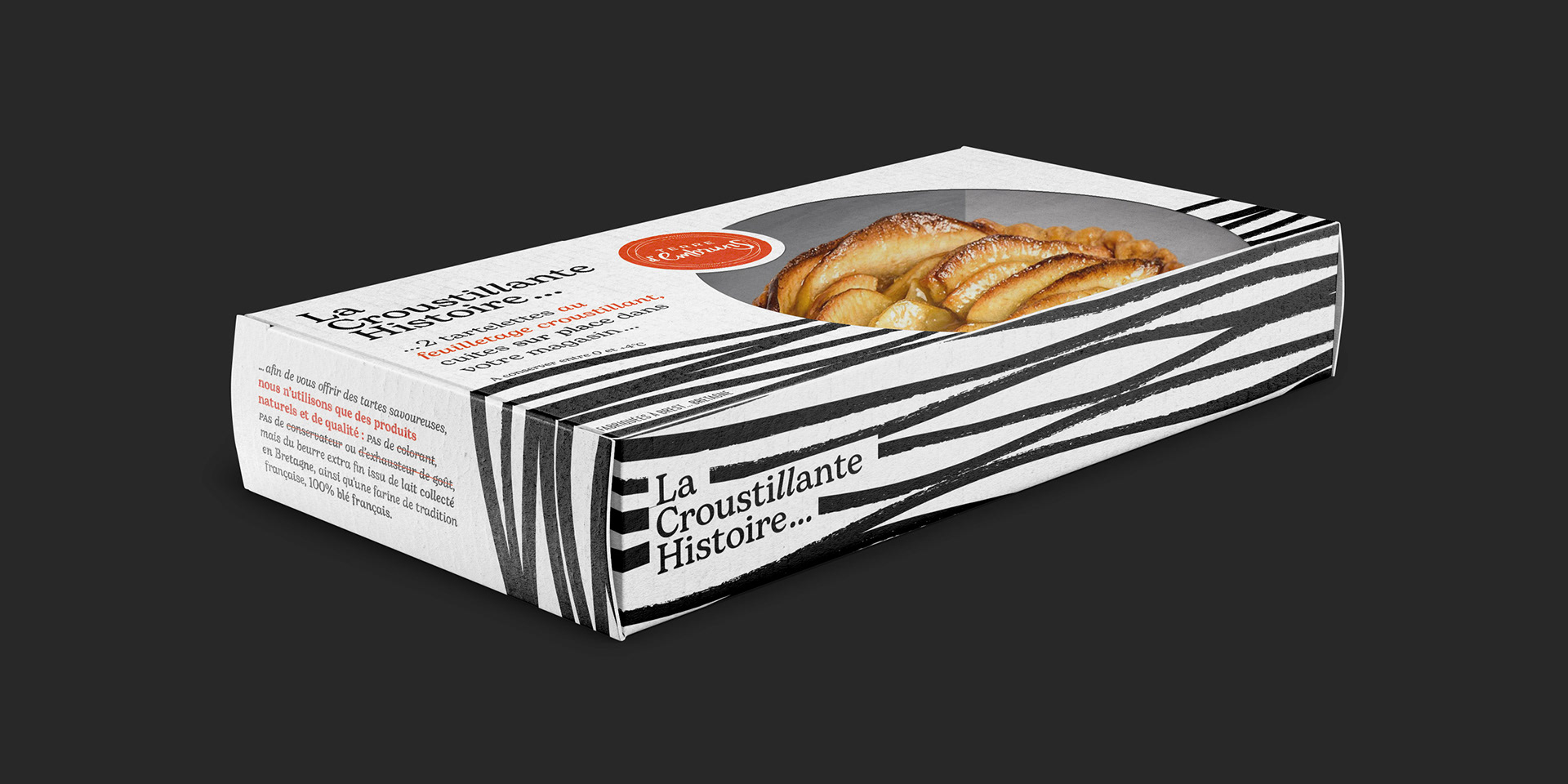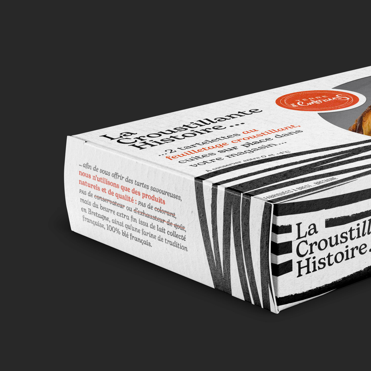 La Croustillante Histoire par Terre d'Embruns ... derrière ce nom se cache l'histoire de Fabrice, son fondateur. Une histoire de voyages, de gourmandise et de pâte feuilleté. Fabrice a grandi enveloppé des parfums de la pâtisserie familiale dans le Finistère. Il aurait pu prendre la suite de son père, mais têtu comme un Breton, il s’en est allé à l’autre bout du monde en répétant : "jamais je ne travaillerai dans la pâtisserie". C'est du storytelling, mais tout est vrai ! Terre d’Embruns est une biscuiterie et tarterie artisanale ancrée dans le territoire de Brest depuis 2007 et c'est aujourd'hui 3 boutiques. Pour se diversifier et attaquer le circuit GMS, la marque a créé "La Croustillante Histoire" avec l'aide d'Élodie Cloarec, d'Éclo marketing et Communication. Pour l'inspiration, tout est dans le nom, tout est dans l'histoire. Une patte croustillante issue d'un savoir-faire unique, que des bons produits, du made in Bretagne comme on aime. En terme de design, je voulais célébrer cette Bretagne tout symbolisant ce feuilletage unique. Un design noir & blanc très japonisant qui se remarque en linéaire. Je voulais aussi un design très littéraire, qui permette à la marque de s'exprimer librement et d'y aller franco. Je voulais aussi que l'on voit bien le produit, c'est stratégique en GMS. Pour la version familiale je me suis amusé à créer une découpe très personnalisée. Une identité graphique déclinée sur le corner GMS, en PLV...