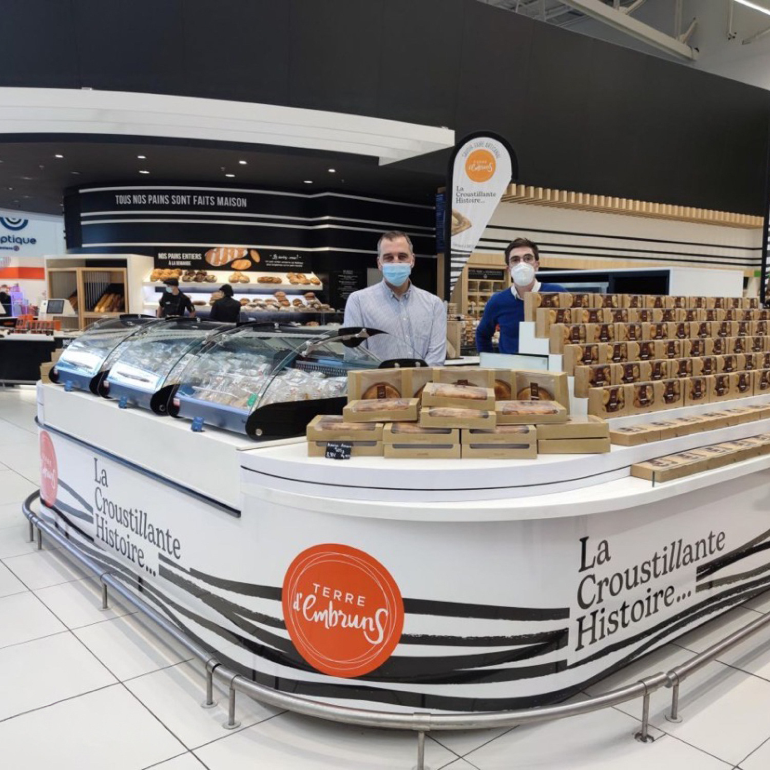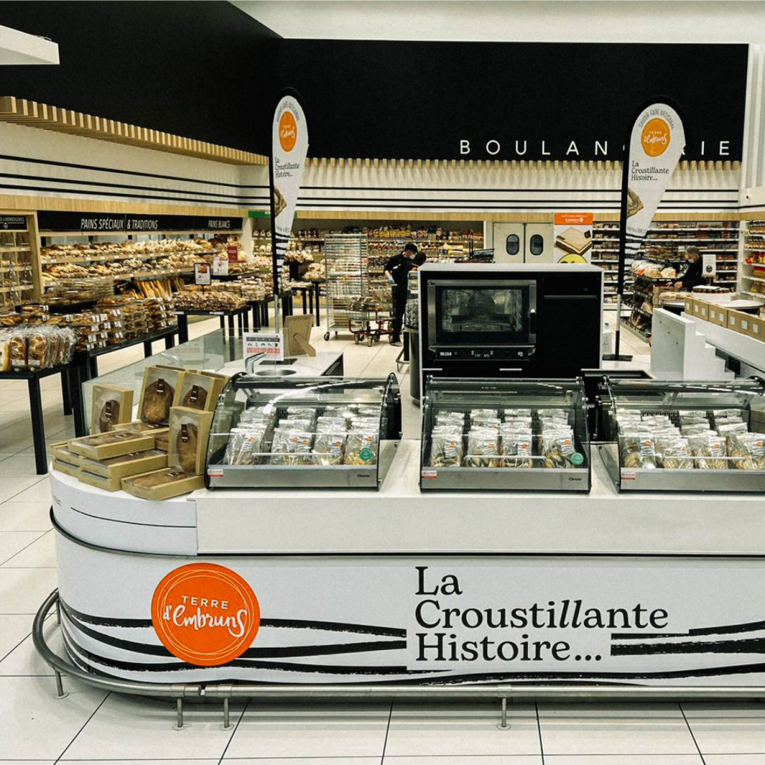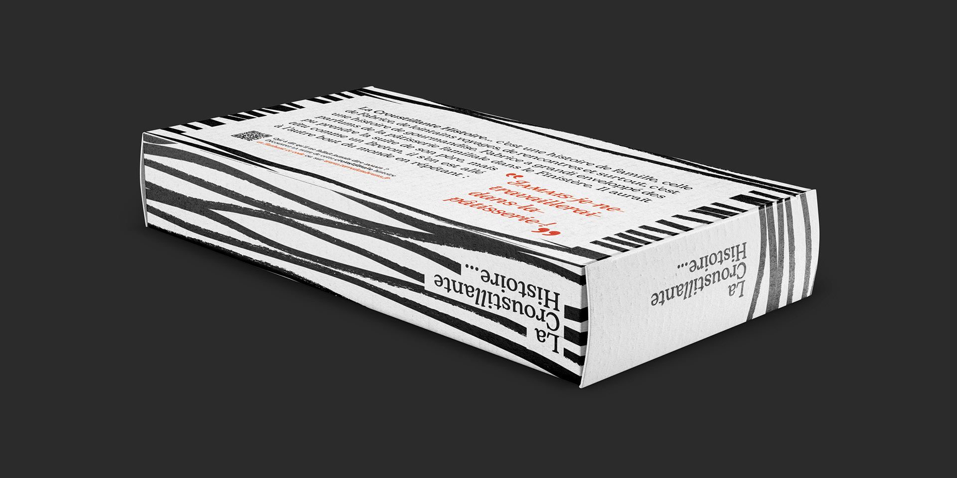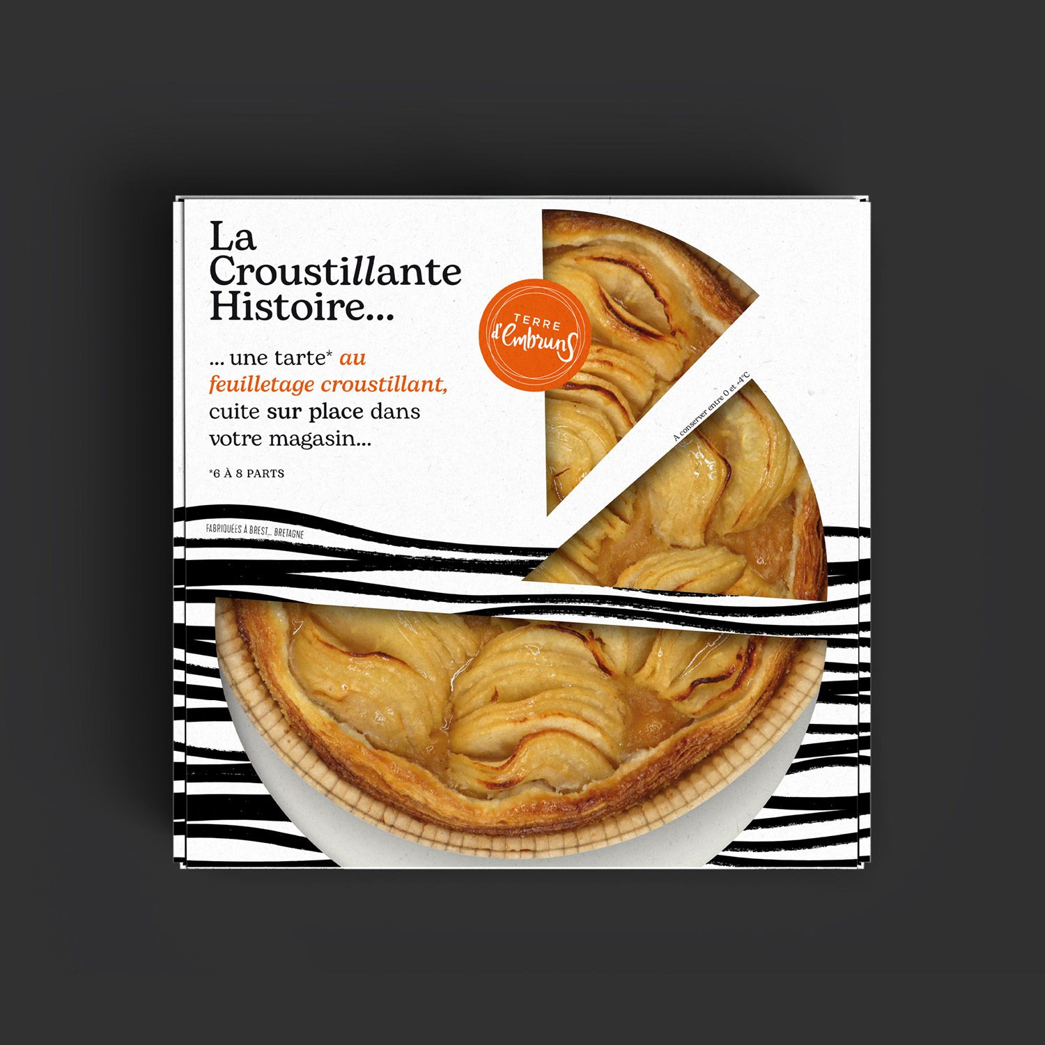 La Croustillante Histoire par Terre d'Embruns ... derrière ce nom se cache l'histoire de Fabrice, son fondateur. Une histoire de voyages, de gourmandise et de pâte feuilleté. Fabrice a grandi enveloppé des parfums de la pâtisserie familiale dans le Finistère. Il aurait pu prendre la suite de son père, mais têtu comme un Breton, il s’en est allé à l’autre bout du monde en répétant : "jamais je ne travaillerai dans la pâtisserie". C'est du storytelling, mais tout est vrai ! Terre d’Embruns est une biscuiterie et tarterie artisanale ancrée dans le territoire de Brest depuis 2007 et c'est aujourd'hui 3 boutiques. Pour se diversifier et attaquer le circuit GMS, la marque a créé "La Croustillante Histoire" avec l'aide d'Élodie Cloarec, d'Éclo marketing et Communication. Pour l'inspiration, tout est dans le nom, tout est dans l'histoire. Une patte croustillante issue d'un savoir-faire unique, que des bons produits, du made in Bretagne comme on aime. En terme de design, je voulais célébrer cette Bretagne tout symbolisant ce feuilletage unique. Un design noir & blanc très japonisant qui se remarque en linéaire. Je voulais aussi un design très littéraire, qui permette à la marque de s'exprimer librement et d'y aller franco. Je voulais aussi que l'on voit bien le produit, c'est stratégique en GMS. Pour la version familiale je me suis amusé à créer une découpe très personnalisée. Une identité graphique déclinée sur le corner GMS, en PLV...
